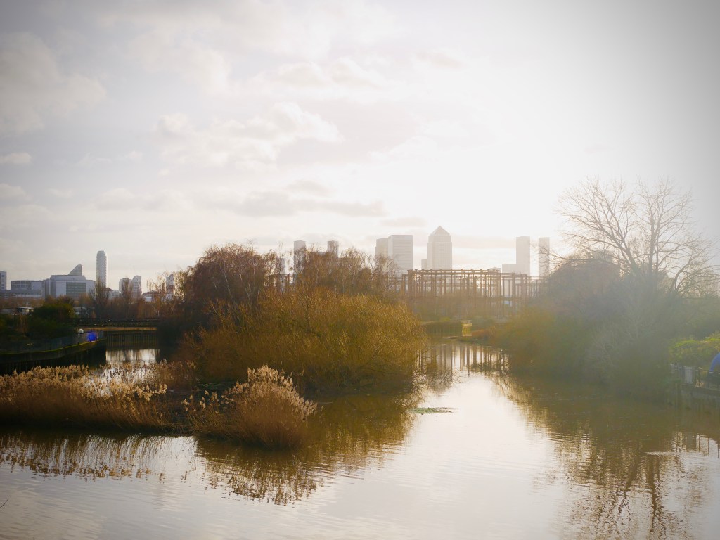 A view from the Greenway pedestrian/cycle route in East London, looking over the Channelsea Island with Canary Wharf in the distance. Reclaimed from its Chemical Works past, back into a true green oasis.